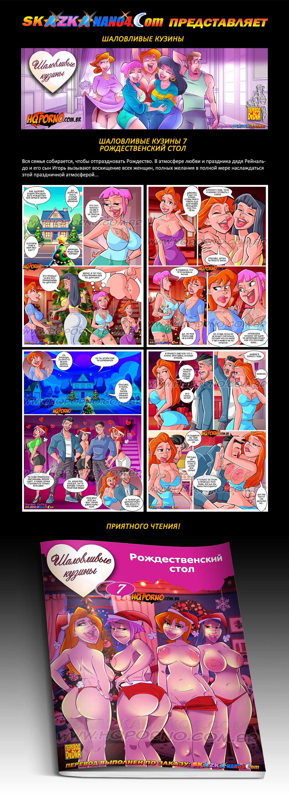Порно комикс «Шаловливые кузины. Часть 7. Рождественский стол.» Вся семья собирается, чтобы отпраздновать Рождество. В атмосфере любви и праздника дядя Рейнальдо и его сын Игорь вызывают восхищение всех женщин, полных желания в полной мере наслаждаться этой праздничной атмосферой…